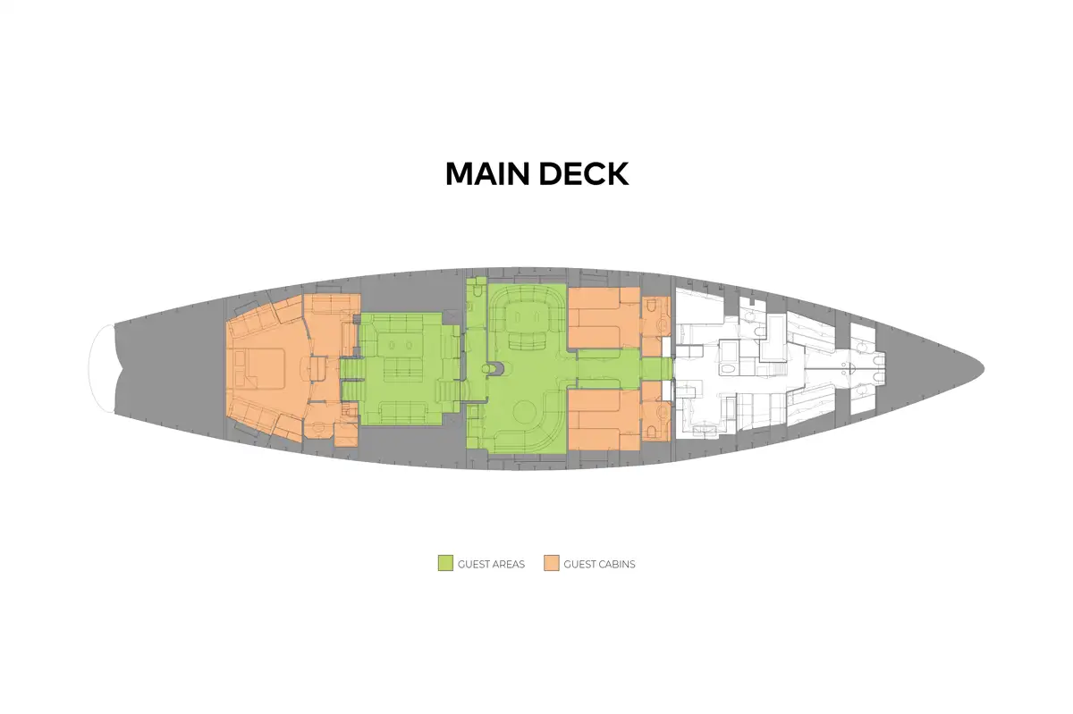 She accommodates six guests. The full beam owner's suite, reconfigured in 2017 to include a king size double berth, is aft, down steps from the deckhouse. It is en suite and two large decklights provide natural light. Forward of the main saloon are two double cabins, also en suite and each with a decklight. She also sleeps six crew in quarters forward with separate deck access.