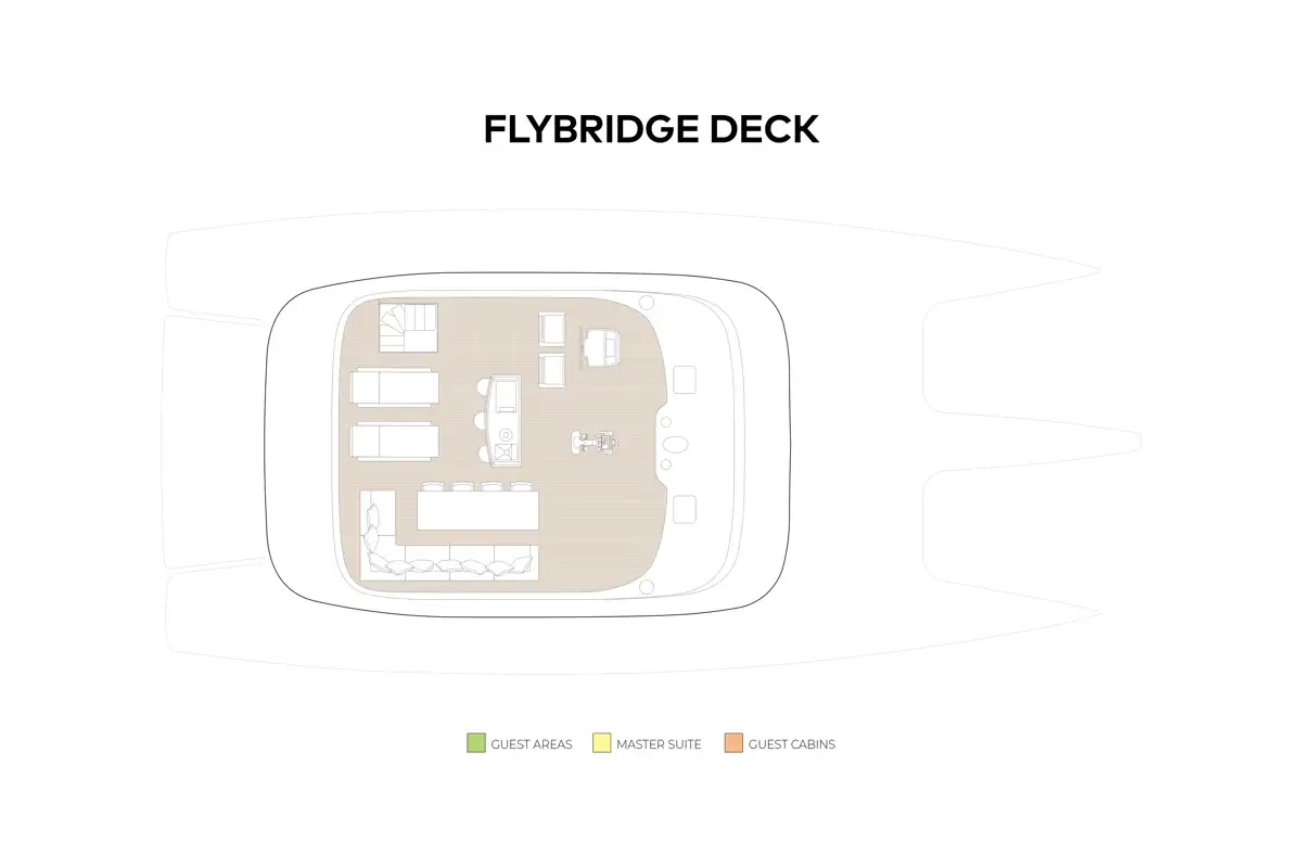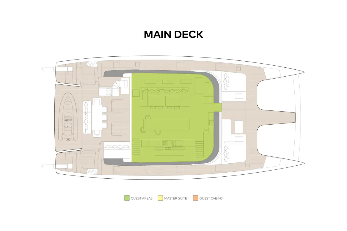 On the lower deck there are four suites for eight guests including an ‘owner’s hull’ to port with a king-sized double berth, his-and-hers bathrooms and a large walk-in wardrobe. Three large hull ports and deck hatches above the bedroom and en suite deliver views and natural light. There are two additional queen-sized double berths in the starboard hull and a third gym/guest cabin aft, all en suite and with similar natural light, along with accommodation for up to five crew.