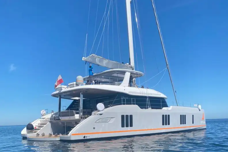STYLIA is a nearly-new 22.8m (74.8ft) sailing catamaran loaded with every upgrade and extra on the list, from carbon spars to lithium batteries, solar panels to a hydraulic swim platform. Constructed to operate commercially though only ever used privately, she was built in GRP and delivered in 2022 by leading Polish shipyard Sunreef.