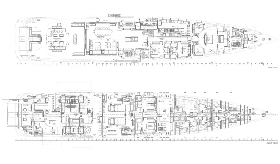 ALCHEMY provides flexible accommodation in six double cabins, one of which can be split into two single berths. The configuration includes a spectacular main deck owner’s suite, a VIP cabin on the upper deck and four remaining cabins located on the main and lower decks. A dynamic layout which allows plenty of space and privacy.