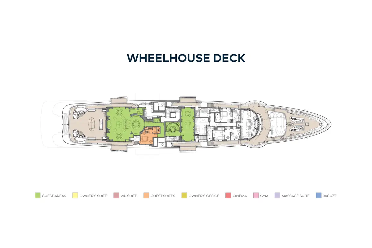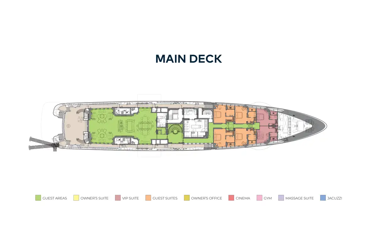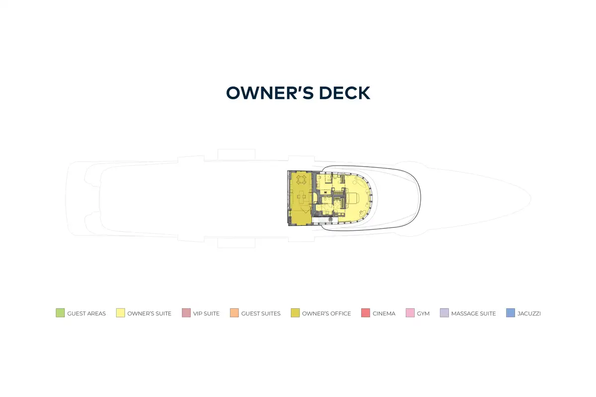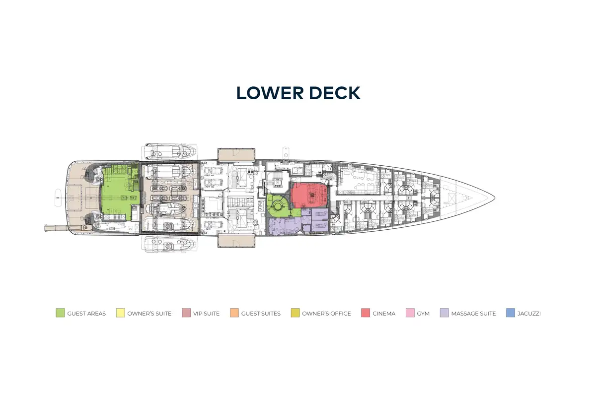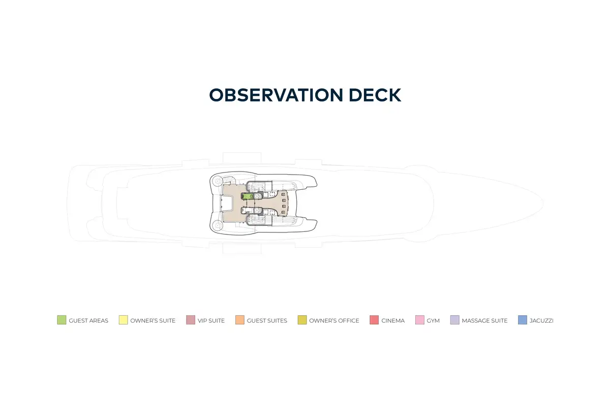 The extensive accommodation on board comprises a unique split owner's suite with stunning ocean vistas and an impressive double height study complete with port and starboard folding balconies and double height glass sliding doors. There is a double guest cabin on the upper deck, four guest cabins and a convertible full beam VIP cabin located on the main deck. Other standout features include a remarkable teak and steel sculpture that envelops the large guest elevator, a spectacular aquarium made to mirror an aquatic reef, an outdoor cinema on the sun deck and a huge lazarette ideal for a watersports enthusiast.