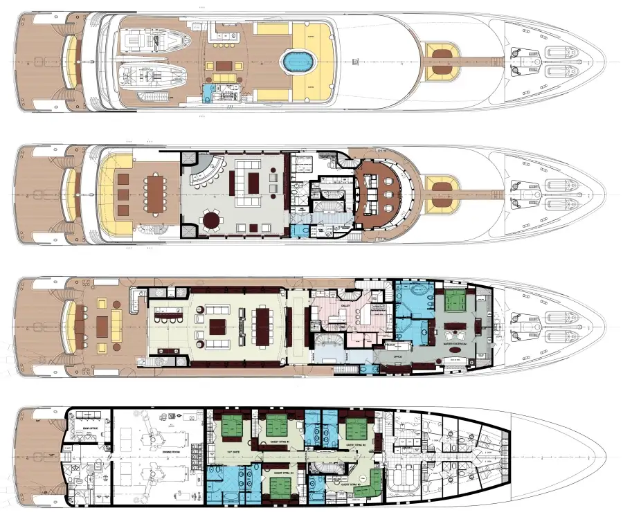 Accommodation is flexible for 12 guests in six beautifully appointed cabins. The full-beam owner’s cabin is on the main deck and offers a large walk-in closet and a private study. The full-beam VIP cabin comes equipped with a bathroom with double shower and separate jacuzzi tub. There’s the option for there to be three full-beam guest cabins, in addition to one twin cabin with two single beds and one fold-out bed. All guest cabins have en suite facilities.