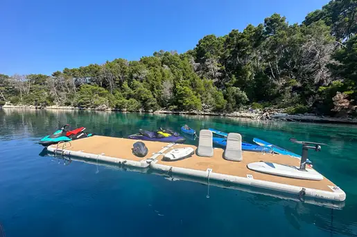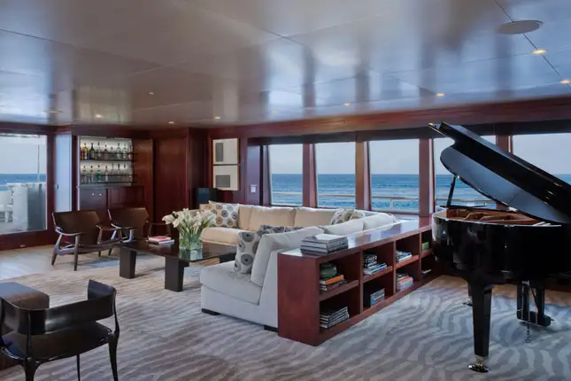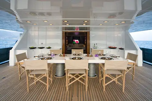 CYAN is a sophisticated offering with a streamlined exterior featuring fine entertainment and a chic interior. Her elegant profile with a dark hull along with ample deck areas are ideal for lounging and entertaining. The latter is her forte. A three-metre outdoor cinema screen comes complete with a movie library of over 1,500 films to choose from. For the more active guests, her extensive toy chest offers waverunners, wake boards, inflatables and more. State-of-the-art technology features throughout including Apple TV, while your own entertainment can be made playing the baby grand piano.