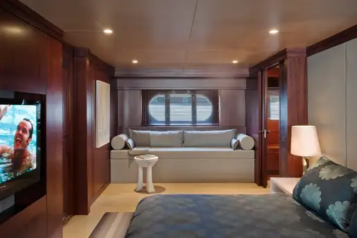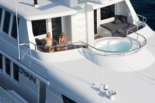 Her decks are capacious with sun pads and al fresco dining areas on her top deck, lounging and seating areas with a bar on her bridge deck, and large al fresco dining area on her main deck aft. Her bridge deck and main deck salons both offer sumptuous seating areas, while an elegant dining saloon on the main deck has seating for formal dining occasions. CYAN is serviced by a dedicated crew of 11 allowing for superb living and entertaining in ultimate style.