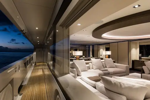 A finalist at the 2018 World Superyacht Awards with interior designed by Radyca, Miami, LAURENTIA blends indoor and outdoor living seamlessly with sliding glass doors and floor to ceiling windows that bring a feeling of light and openness to the inside spaces.