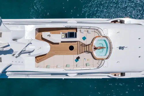 Retire to your 70sqm owner’s suite on the upper deck to change for the evening. The luxurious suite features a beautiful marble bathroom, large walk in wardrobe, private lounge and office. The remainder of the guest accommodation is very well appointed, including a VIP suite, three doubles and two twin cabins, while zero speed stabilisers assure comfort on board. The yacht’s Studio Vafiadis design features cream walls and furnishings complemented by dark wood and bright pops of colour from contemporary art.
