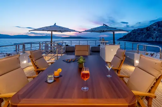 Everyone comes together for a delicious lunch of freshly prepared local produce on the sun deck. After the morning’s exertions, why not recline on the nearby sun pads located next to the inviting jacuzzi, while the yacht’s attentive crew provide a steady stream of refreshments from the sun deck bar.
