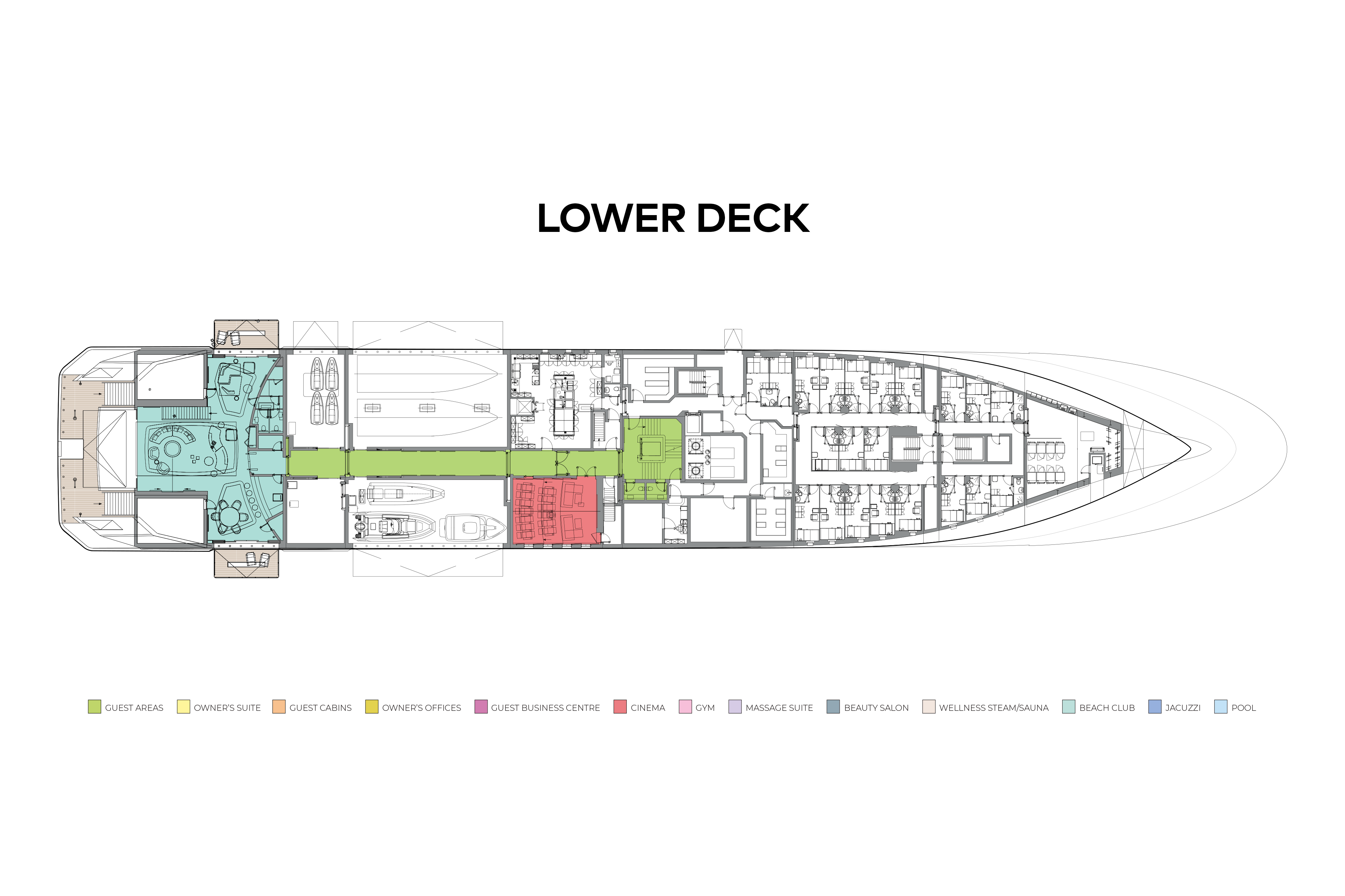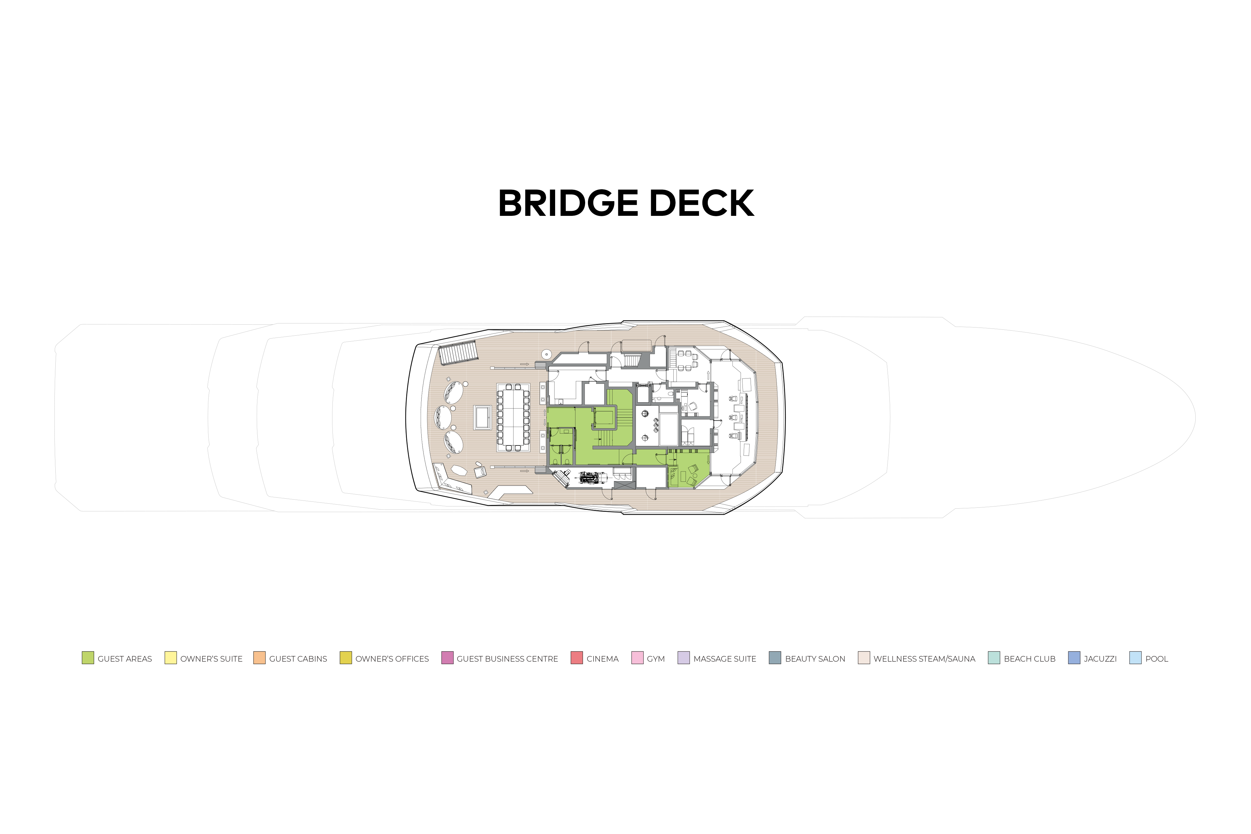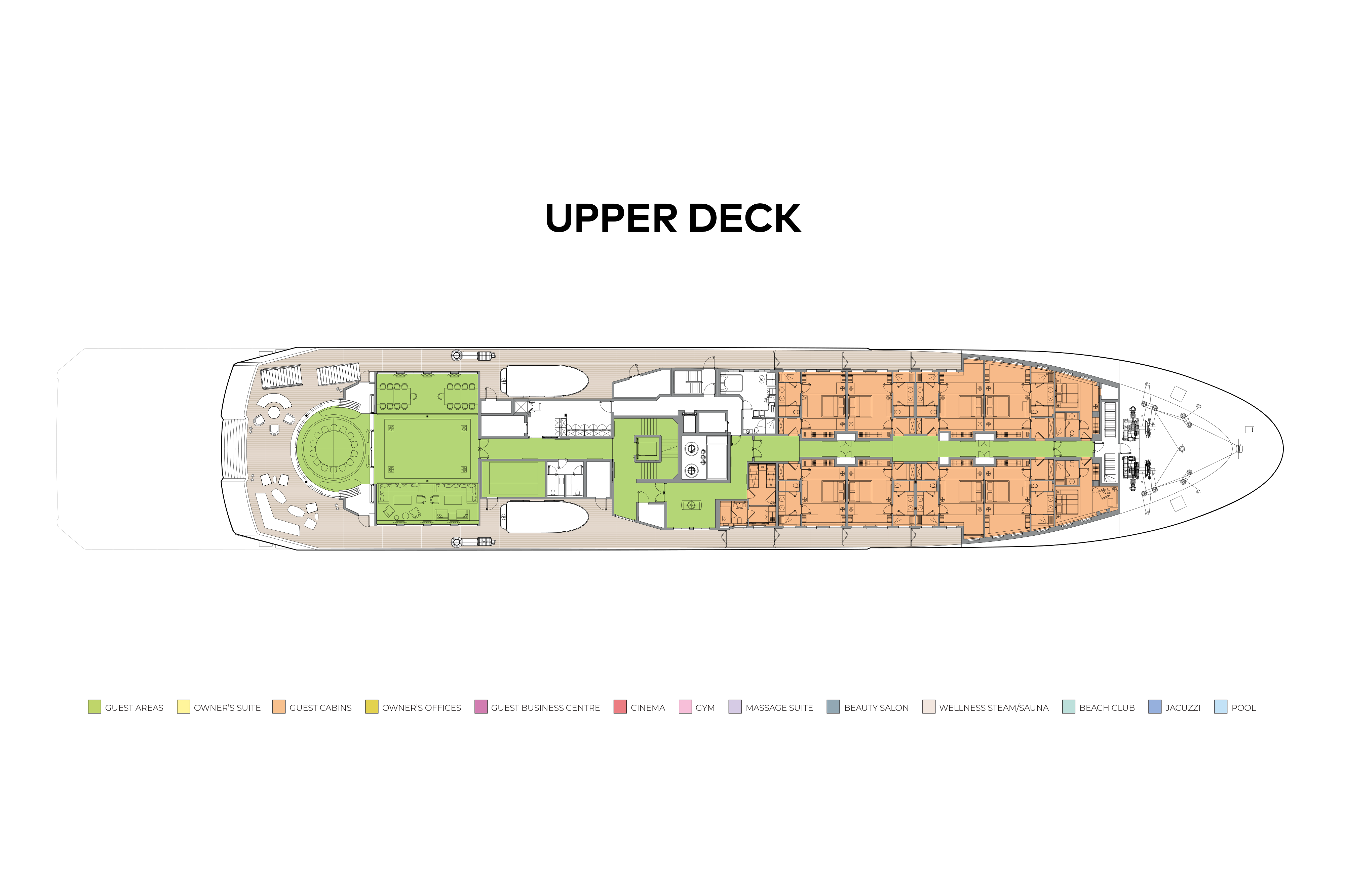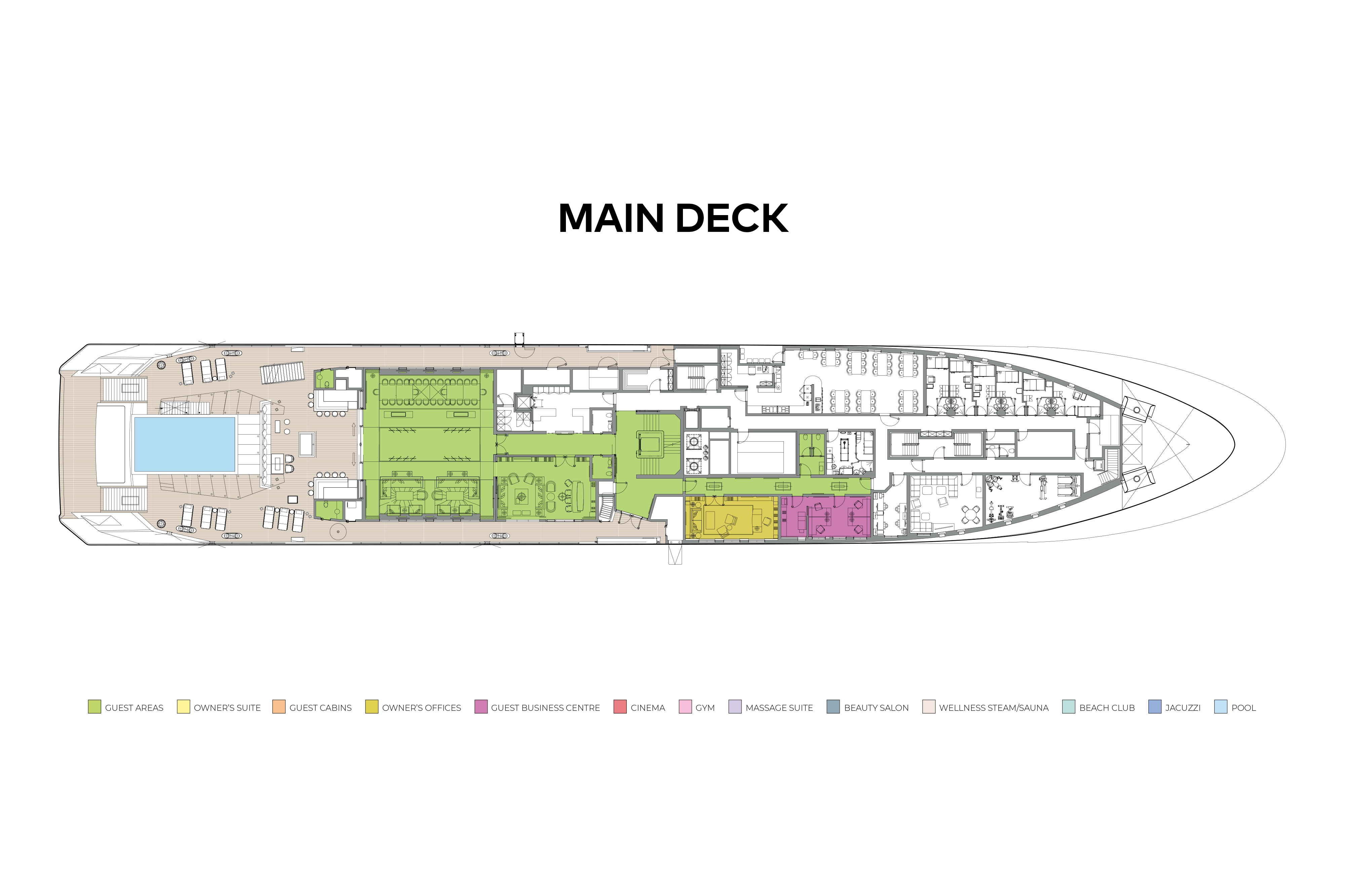 - Spa deck with wellness area, treatment rooms, plunge pools, steam/sauna rooms, hairdressing/beauty room and fitness centre