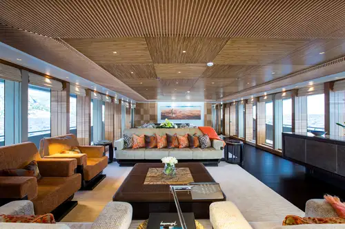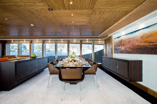 Inside, her interior makes use of indigenous material like bamboo and Australian silky oak to create a relaxed, comforting environment. Floor-to-ceiling glass in the main lounge and formal dining room create a remarkable sense of openness and that flows into the main deck aft lounge area. There's shaded open-air dining and a sun lounge on the upper deck aft and inside is a home cinema with an 80in screen and surround sound for movie nights.