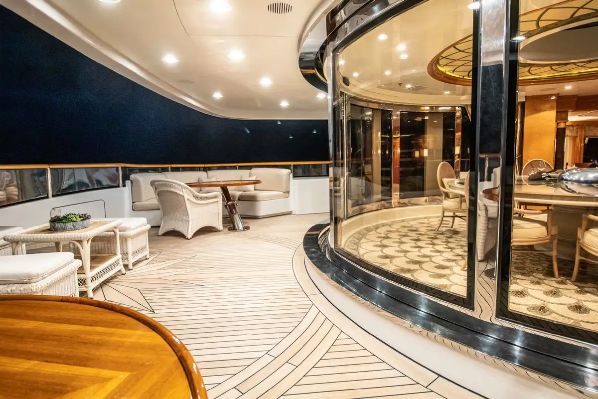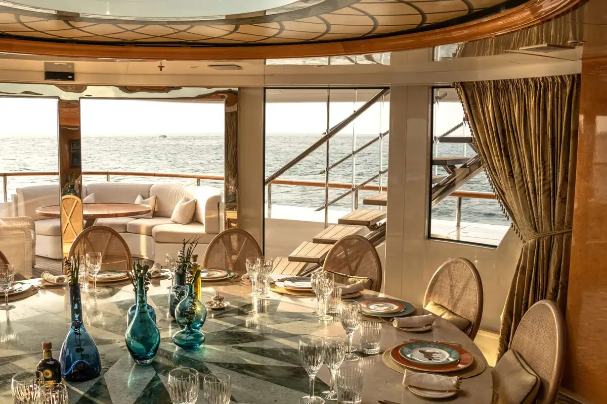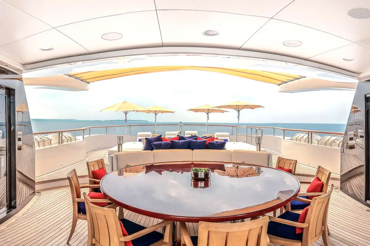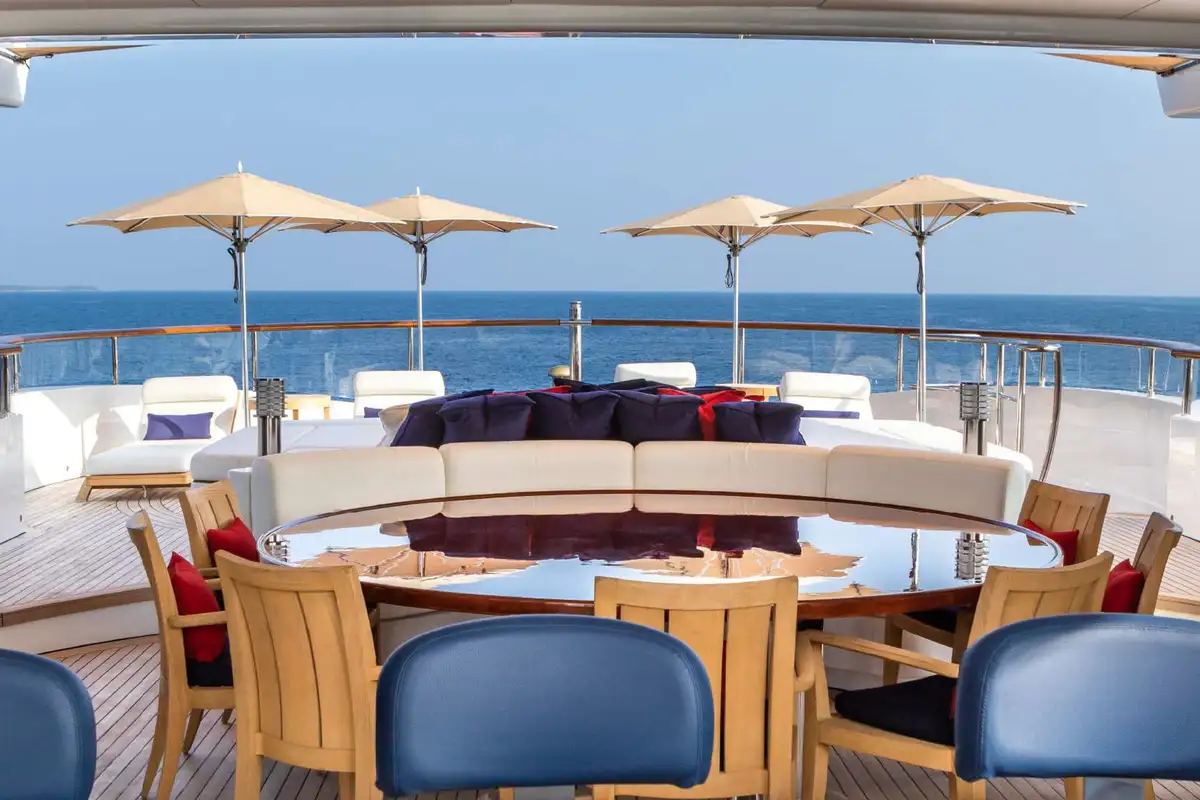Once settled, head outside to discover the yacht’s multi-dimensional entertainment spaces spread over her three decks. You will most likely choose to spend the majority of your day on the sun deck for al fresco living at its very best. Take a dip in the jacuzzi, relax on the sun pads, dine, drink and play to your heart's content. When the sun gets too hot, take refuge on the upper deck. The sky lounge is one of the yacht’s best features and is also where you can enjoy a semi al fresco dining experience with large sliding doors open to the aft deck.