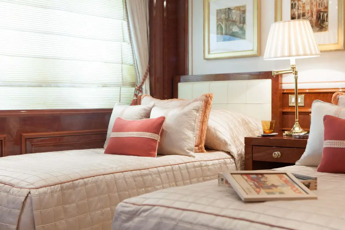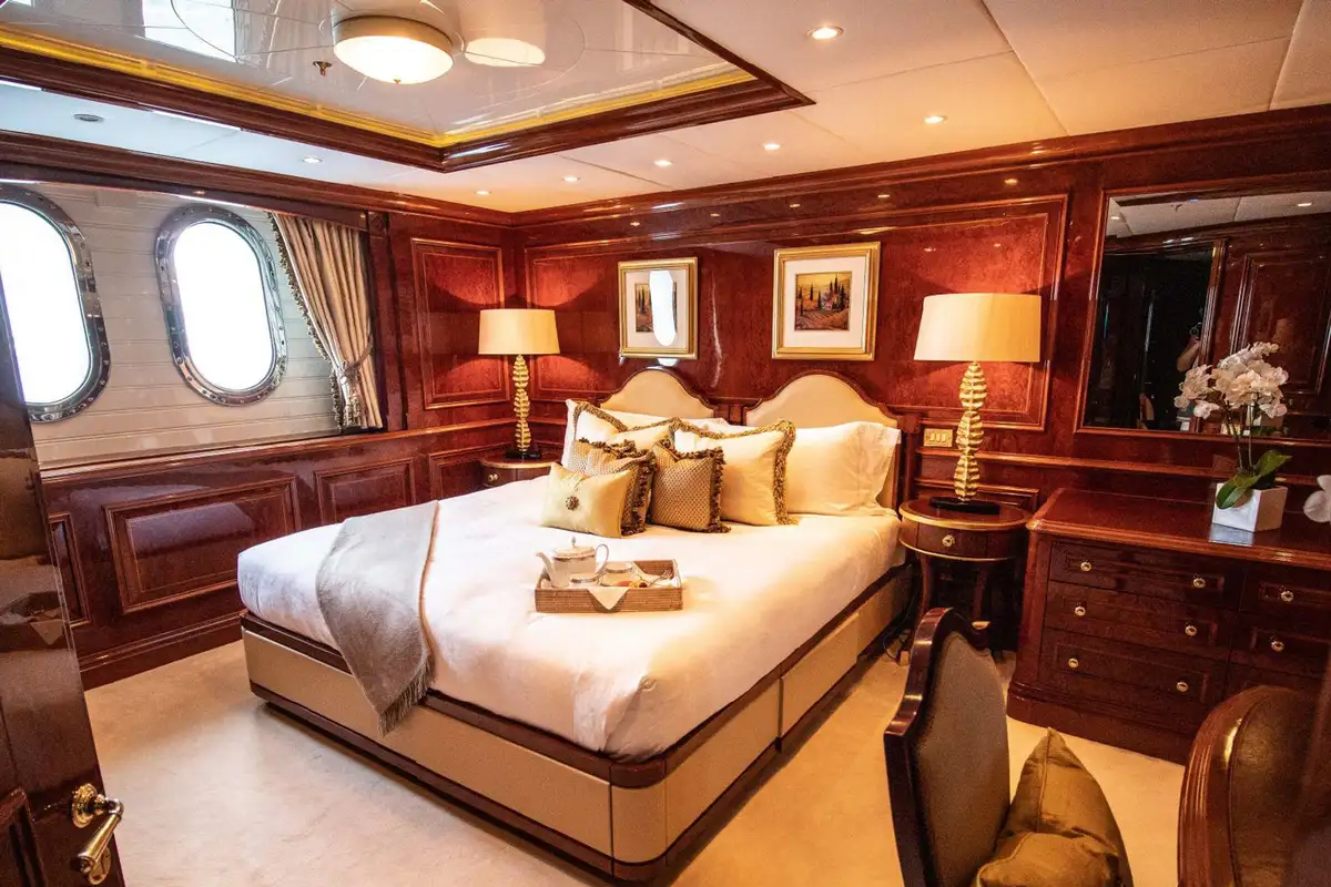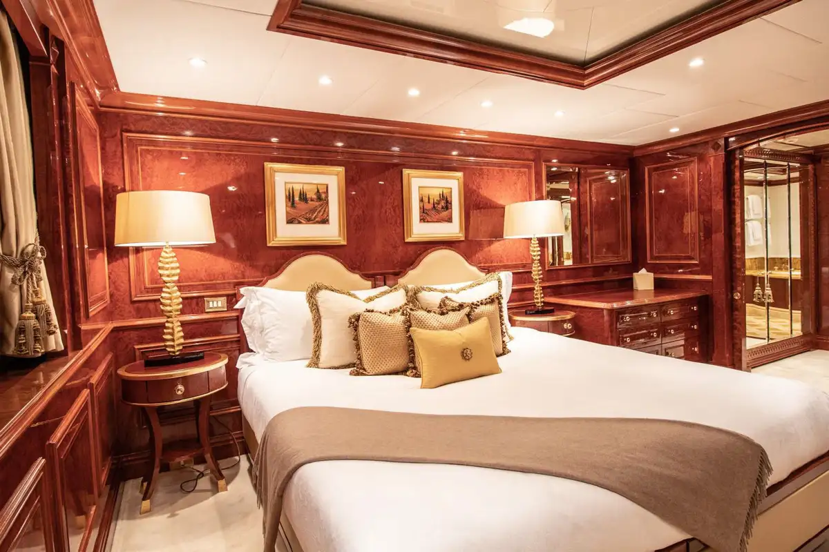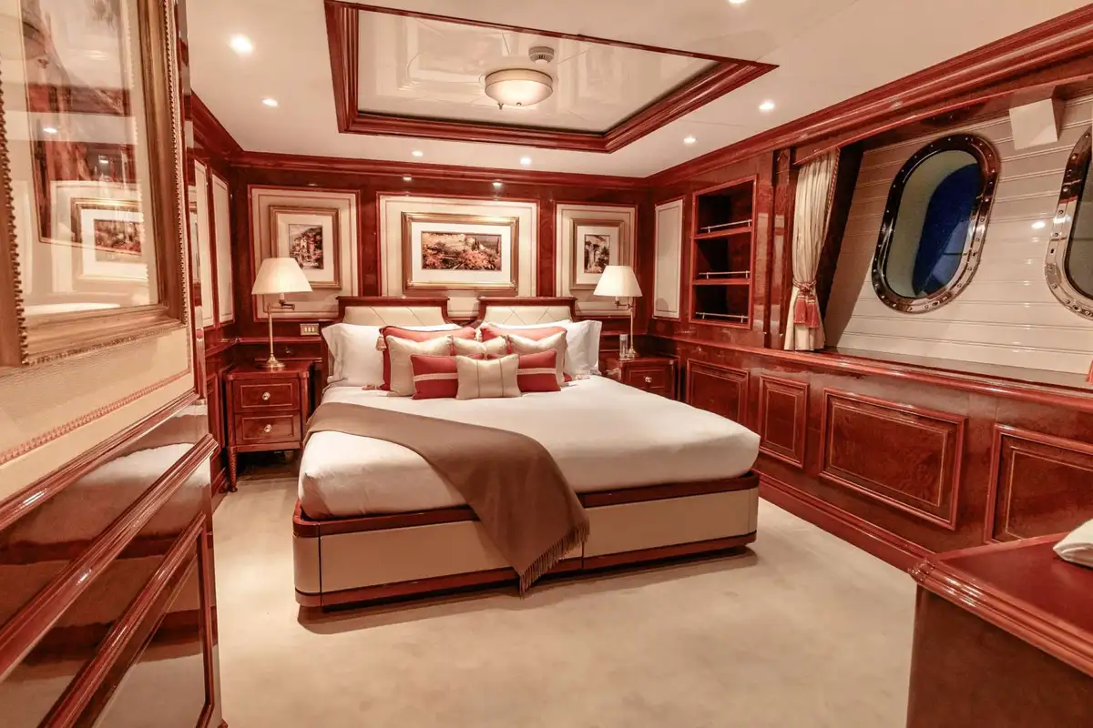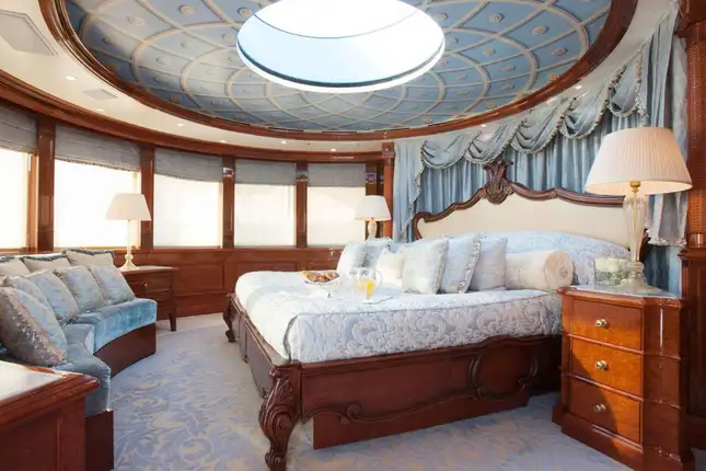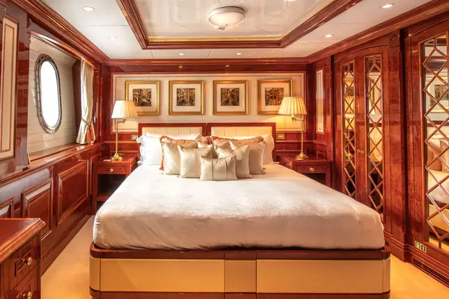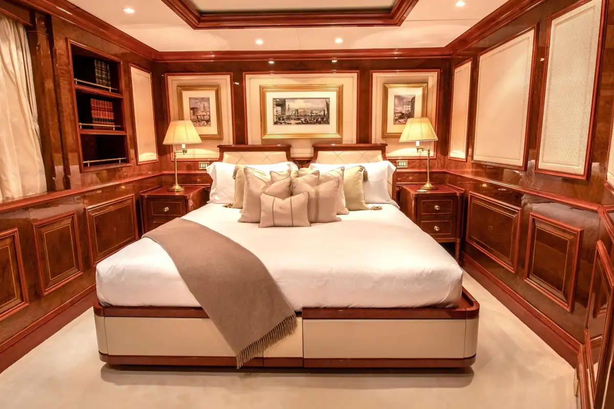 Boarding ST. DAVID, sit back and relax on the large main deck sofa with a refreshing drink while being introduced to your award-winning crew. From here, step through the sliding doors to the opulent bar area preceding the main lounge, the perfect place for pre-dinner Martinis. Moving through the main saloon and formal dining area to the ornate floating staircase at the centre of the yacht, your crew will escort you to your cabin. ST. DAVID accommodates up to 12 guests in six opulent cabins, including a split level master suite. Located on the main deck, the master suite includes a private study, his and hers bathrooms, and one of the finest sleeping quarters to be found on any yacht, with steps leading up to the raised area where the bed is topped by a skylight and affords 180-degree views forward. Further guest cabins include a VIP suite and four flexible double cabins, all located on the lower deck.
