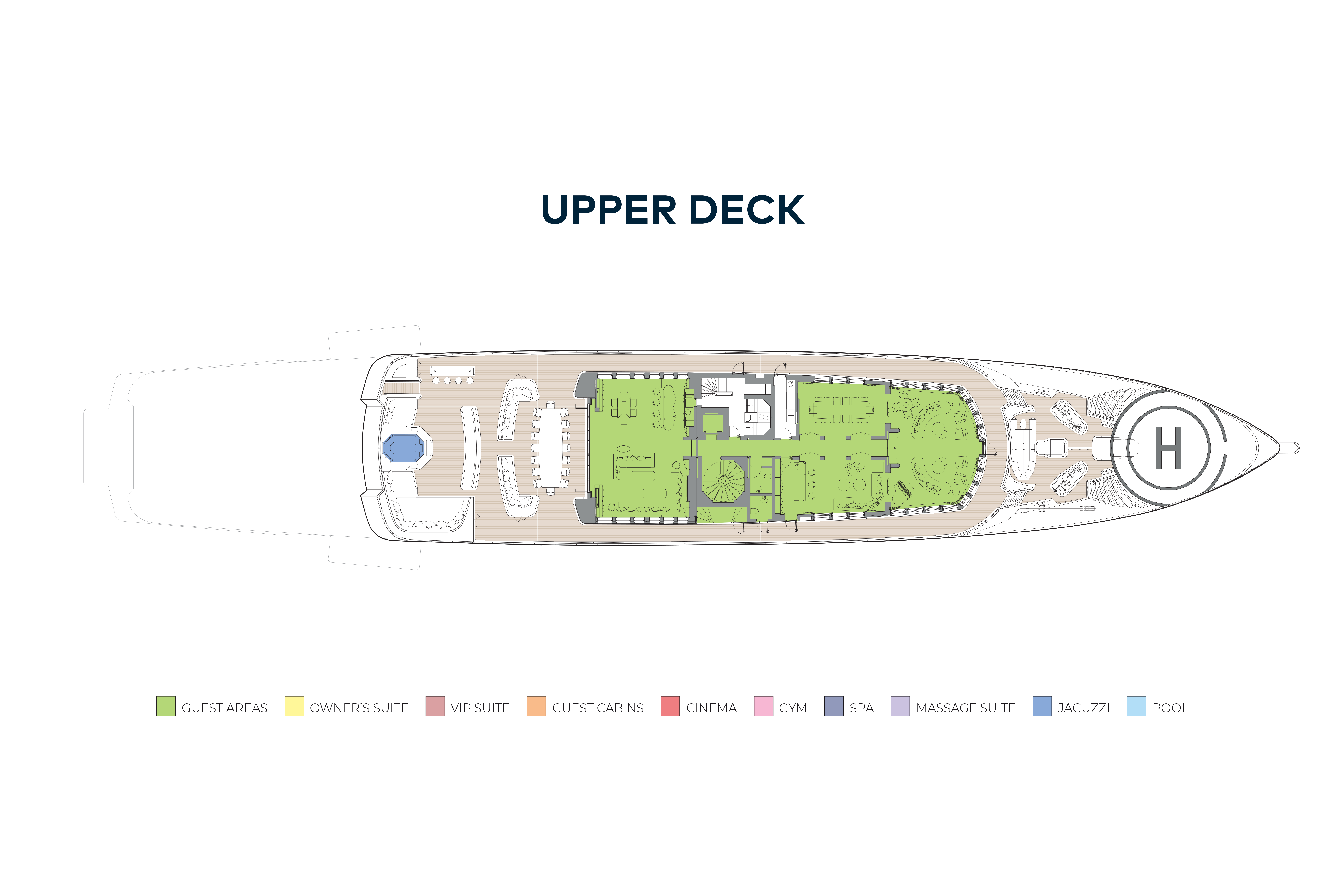 On the sun deck there is a cigar clubroom complete with working fireplace and its own wine cellar and humidor. Other entertainment spaces include the sit-up bar and lounge in the beach club, upper deck's helipad and the main deck aft presents a huge, versatile area when three of her four tenders are launched.