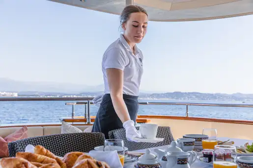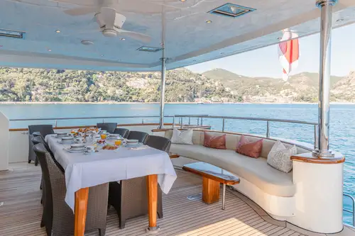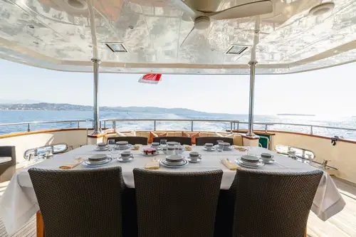 The sun deck includes a jacuzzi plus a bar with BBQ and dining area complete with a state-of-the-art surround system. Ideal for those lazy sea days. Forward of the bridge, also on the sun deck, an added relaxation area is present; guests can take in the idyllic scenery of the Mediterranean from this heightened position.
