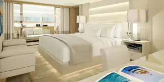 When at anchor, the yacht has balconies which fold down, allowing guests to relax, enjoy a glass of wine, or even jump off the side of the yacht into the water.