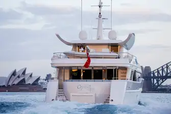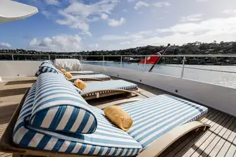 On passage her 5.4m (17.7ft) Mike Pearce NZ inboard diesel-powered RIB tender and toys are stowed on the bridge deck aft. When those are launched by deck crane the space serves many purposes, from sun lounging to entertainment, and could serve as an open-air dining option.