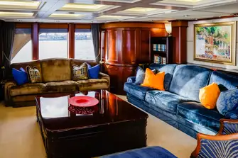 The main saloon has three sofas around a coffee table facing a large TV to starboard. Forward of a staircase leading to the sky lounge is a formal dining room and steps to starboard lead down to lower deck accommodation. The sky lounge itself has convivial C-shaped sofa seating around a coffee table.