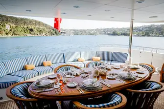 The main deck aft is devoted to open-air dining with an oval dining table and club chairs shaded by the overhang. Aft of that is an arc of sun lounge seating and steps either side lead down to the swim platform.