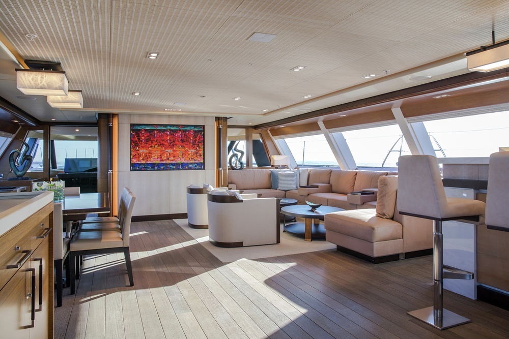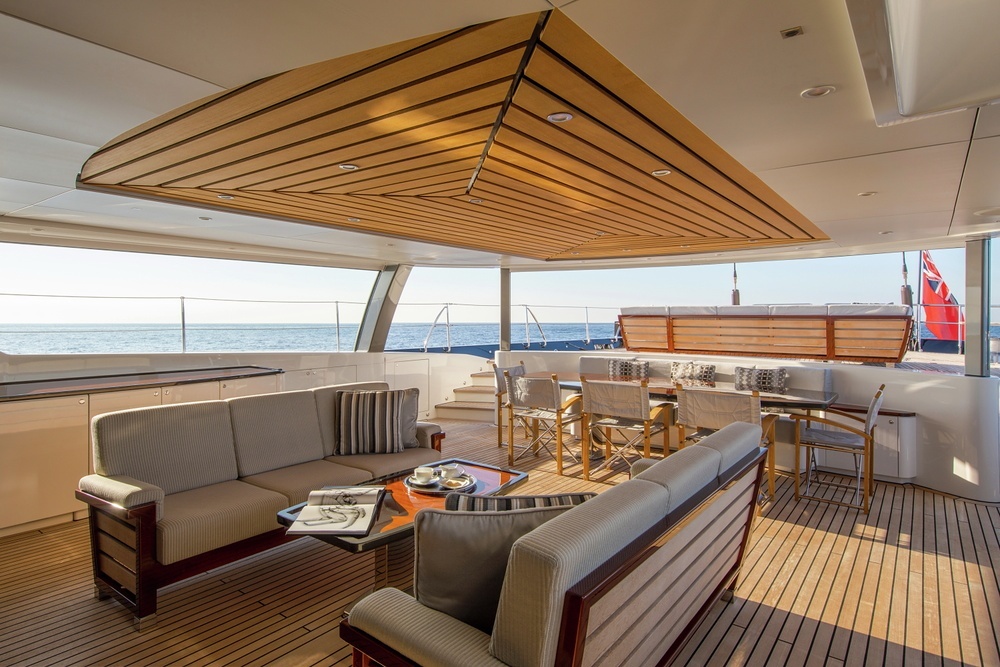 She has a foredeck jacuzzi, which is rare on a sailing yacht, and a shady open-air dining area. Below decks the light, bright climate-controlled lounge is a fantastic living space.