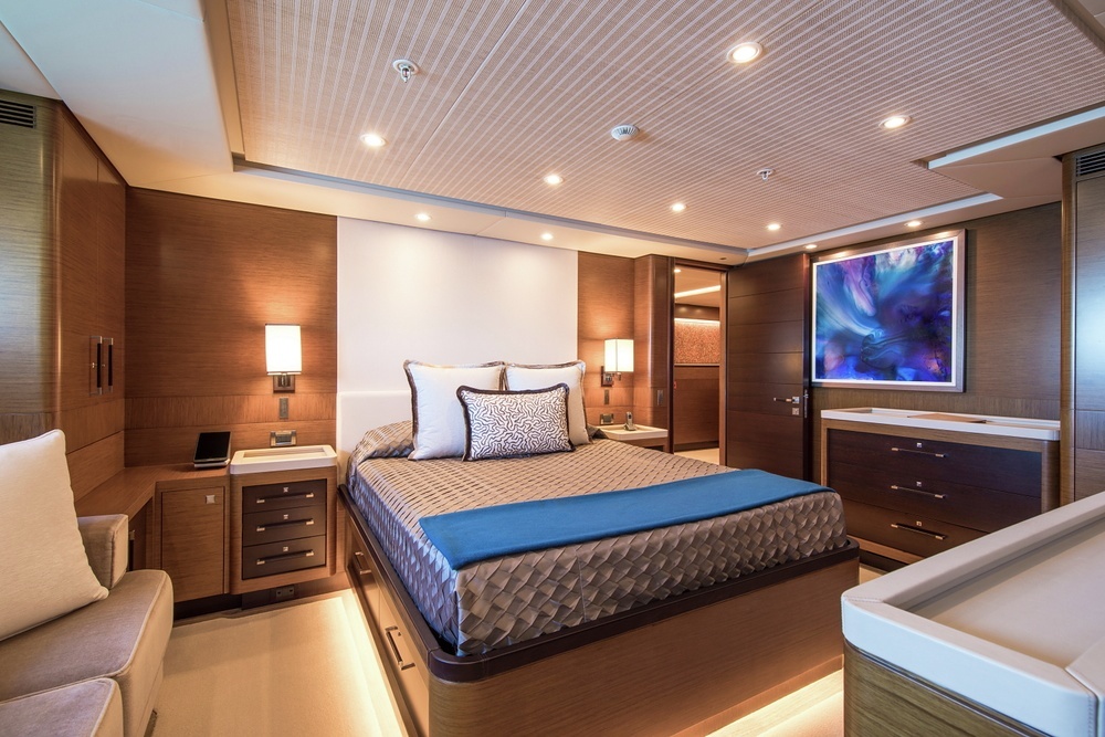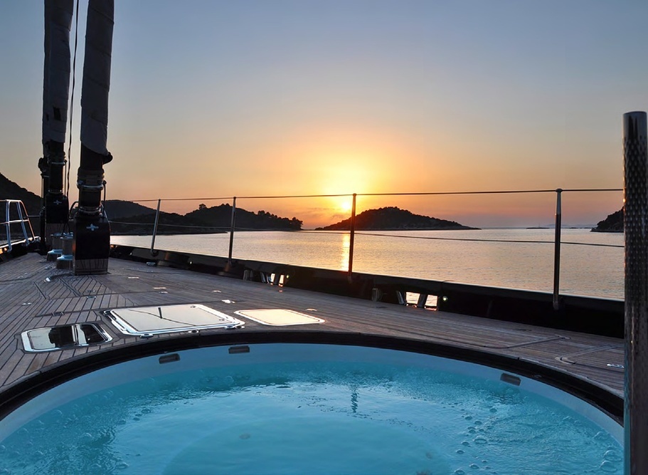 When at anchor, the swim platform is dropped into place astern and the water fun begins! There’s a broad seating area on the aft deck, next to the bar, where people can relax and sunbath. Plus, the foredeck jacuzzi of course!