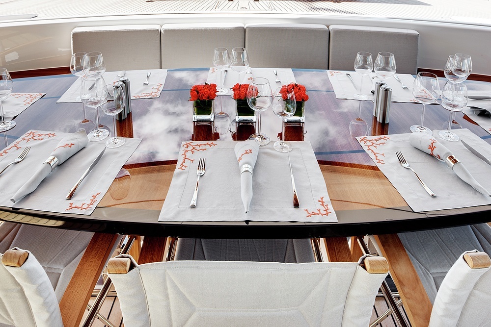 The flybridge is a popular spot to be when under sail, and then on a still summer day, an awning can be put up here and lunch is served in the shade whilst enjoying the view. For dinner, the awning gets put way for an al fresco meal under the stars.