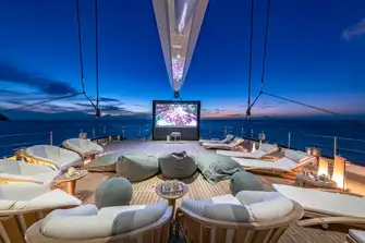 Night sailing is very romantic. The luminescence in the water is magical and the sky on a beautiful night is really special – the stars look so close you could touch them. There is also the outdoor cinema on the aft deck, I expect that will be a favourite with guests wanting to sit out on a balmy evening and enjoy a movie.