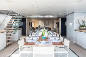 The main deck formal dining room has folding balconies outside full-height sliding glass doors and there is open-air dining shaded by the overhang on the main deck aft.