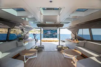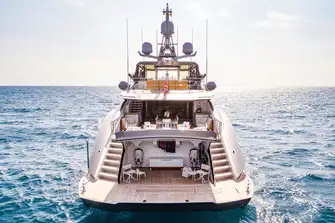 Aft on the lower deck is a beach club for sea-level lounging and a large swim platform with built-in passerelle.